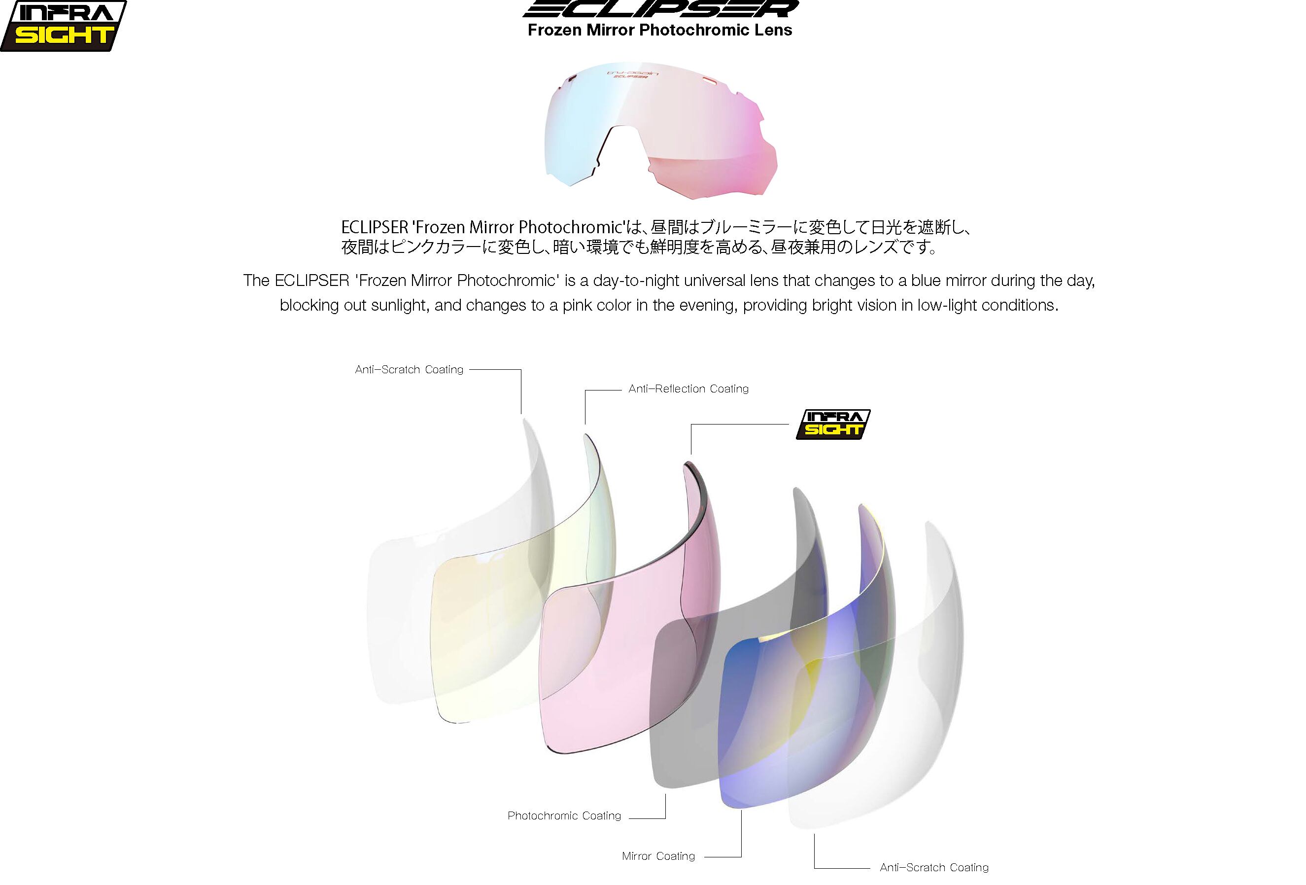 紫外線量によって自動的にレンズの濃度が変化する調光レンズ。トンネルや夜間など紫外線が少ないシーンではクリアに、野外など紫外線が多いシーンではスモークにレンズ色が変化します。さらに眩しさを軽減するミラーコートを施すことで、光を反射し、より効果的に目を保護します。