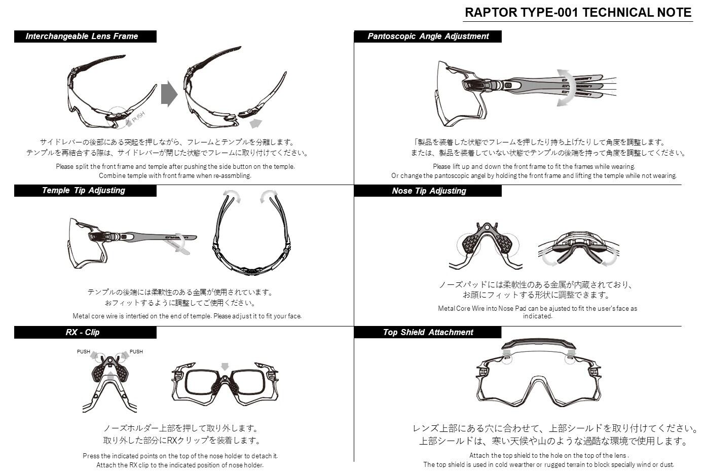 モダンとノーズパットはフレキシブルに可動するため、自身の顔幅や鼻幅に合わせてフィッティングを調整できます。また、着用状態でフレームを押したり持ち上げたりすることで、3段階のフロント角度調整が可能です。
