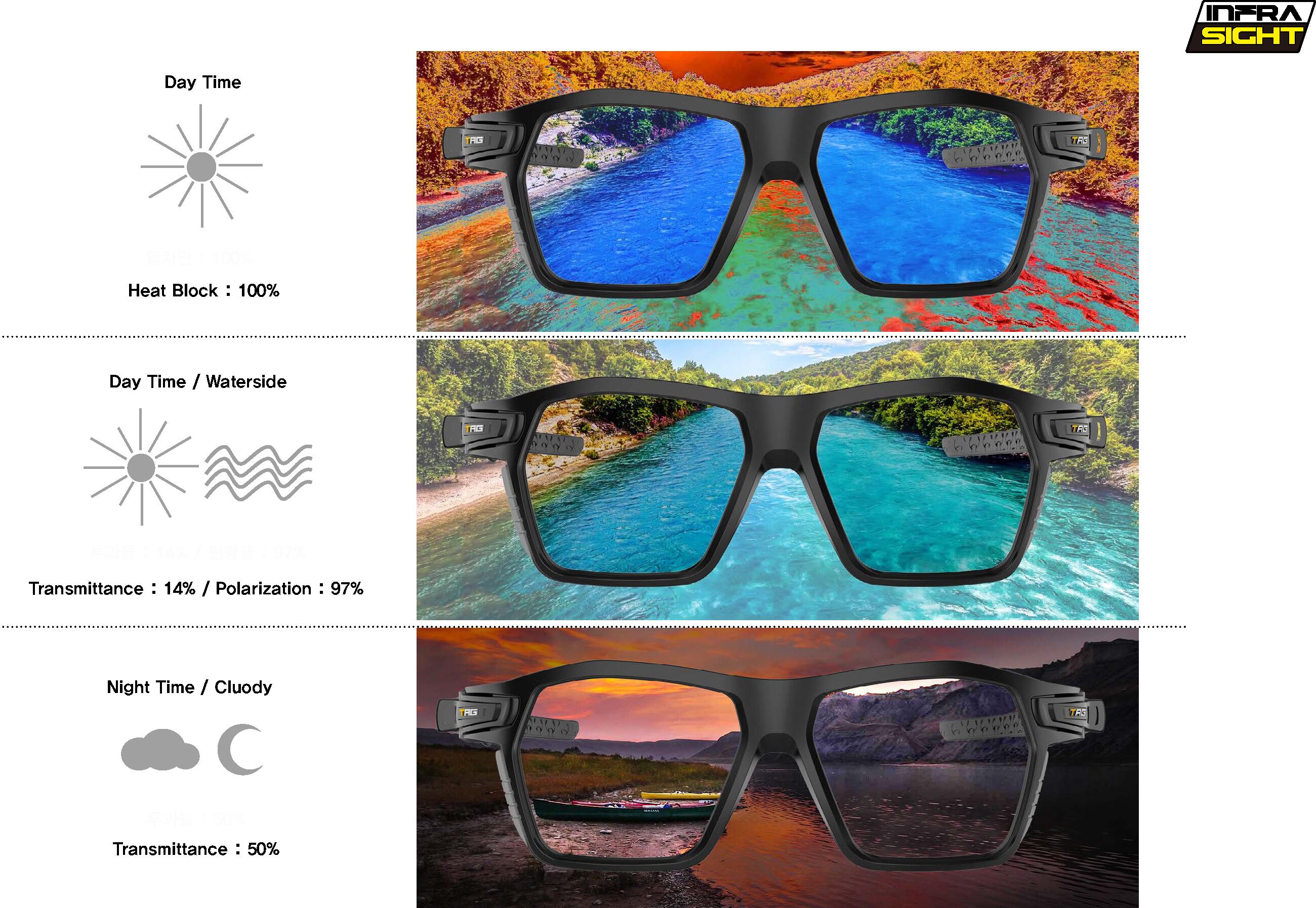 赤外線70%カット/偏光機能付き。屋外では紫外線量に応じて暗くなり、屋内や夜間ではライトスモークに変色するレンズを採用。赤外線熱を遮断することで、暑い環境下でも目の負担を軽減します。