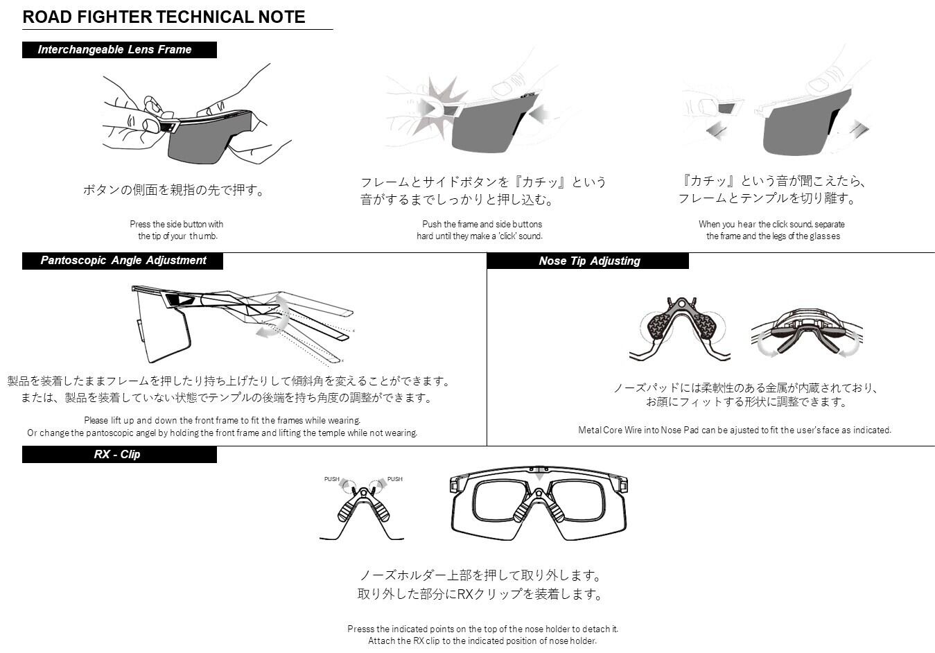 フレームは超弾性樹脂のTR90。ROAD FIGHTERのTR90は軽量で弾性に優れた素材で、アスリートに快適なかけ心地を提供します。